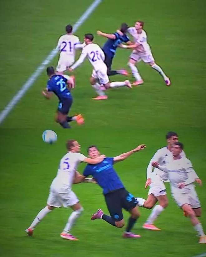 從第50分鐘開始,國米在10分鐘內(nèi)制造了5次有威脅的進攻!但鄧弗里斯、迪馬爾科、比塞克的4次射門要么稍稍偏出球門,要么被對方防守球員封堵,還有德赫亞高接低擋連續(xù)兩次鋒線神奇撲救,國米始終無法得分。還有第54分鐘,皮奧在禁區(qū)內(nèi)被對方后衛(wèi)科穆佐鎖喉拉倒,這么明顯的點球犯規(guī),但主裁判和VAR都選擇無視,否則國米的破門會來得更早!